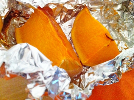 Heizen Sie den Backofen auf 150 °C vor und schneiden Sie den Kürbis in grobe Stücke. Dann legen Sie jeweils 2-3 Stücke Kürbis auf ein Stück Alufolie. Legen Sie ein ebenso großes Stück Alufolie darauf und schlagen Sie die Kanten ein. So ergeben sich kleine Päckchen.